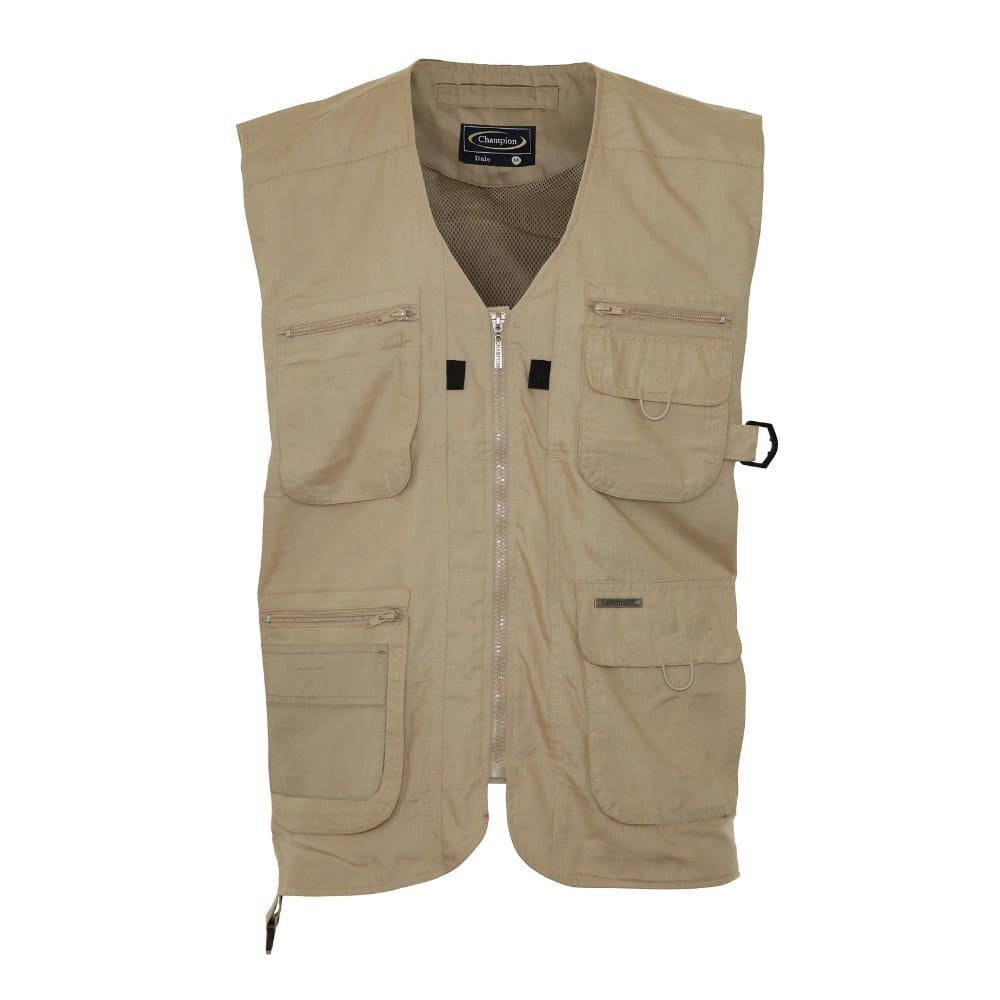 Chaleco Dale de polialgodón de peso pesado y múltiples bolsillos de Champion, que ofrece una excelente durabilidad sin comprometer la libertad de movimiento. Este chaleco multibolsillos para actividades al aire libre, con cuello en V, está confeccionado en un tejido ligero pero resistente de poliéster/algodón, con forro interior de malla y una amplia variedad de bolsillos con cremallera y velcro.